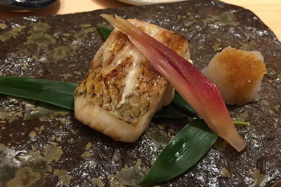 Dinner is a pricey S$220 for just sushi, or S$300 if you want the variety of appetisers. You might need to blow S$450 to hit any kind of high. We settle for medium over high - the S$300 meal which gives you fancier things that you don't see at lunch. You kick off with an interesting cold simmered sauri (fish) with slippery sticks of yam paired with a slice of fresh fig drizzled with sesame sauce; hirame and scallop sashimi; kinmedai served two ways - lightly cooked and dressed in ponzu sauce, and steamed in wine; grilled milky sweet nodokuro.