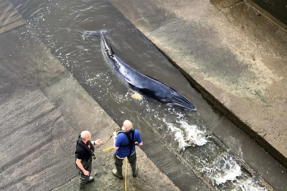 A small crowd of people gathered to watch as the team worked to remove the whale from the lock, hosing the animal down, and then putting a large yellow float around it, video footage obtained by Reuters showed.