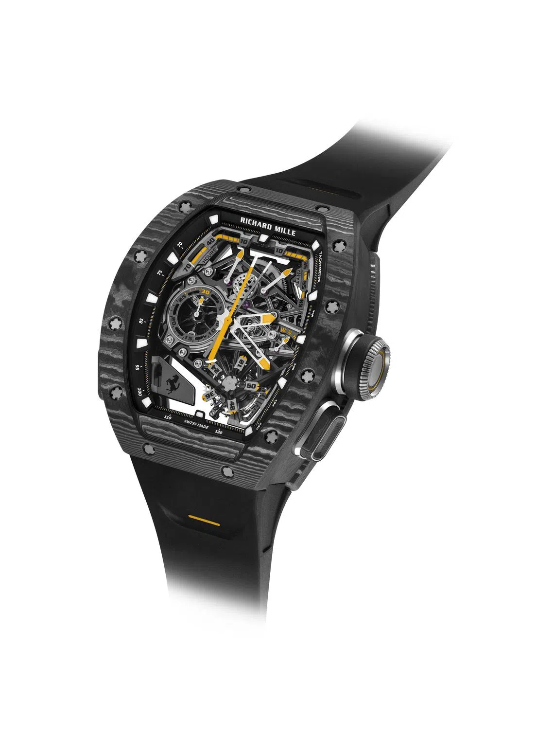 The new watch will be available in two distinct personalities, as Richard Mille’s casing technical director, Julien Boillat, puts it: there is the “gentleman driver” version in microblasted and polished Grade 5 titanium with a Carbon TPT (a lightweight and durable thin-ply composite used exclusively for Richard Mille) caseband, as well as the “high-octane” Carbon TPT variant for those who prefer their luxury with more attitude. Both are limited to 75 pieces each.