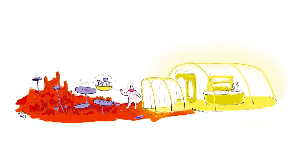 She explains: "I was drawn to the optimistic imagery of space travel in the '70s and the ideas being introduced at the time, such as the Stanford Torus and Buckminster Fuller's book Operating Manual For Spaceship Earth... I was also struck by the correlation between the tropical futuristic aesthetic of Singapore, the visual language of space habitats and the notion that constraints forge innovation. There are many parallels I could draw between space exploration and Singapore. So, the scenography also serves as a little nod to Singapore, one that looks to the future for inspiration rather than our past."
