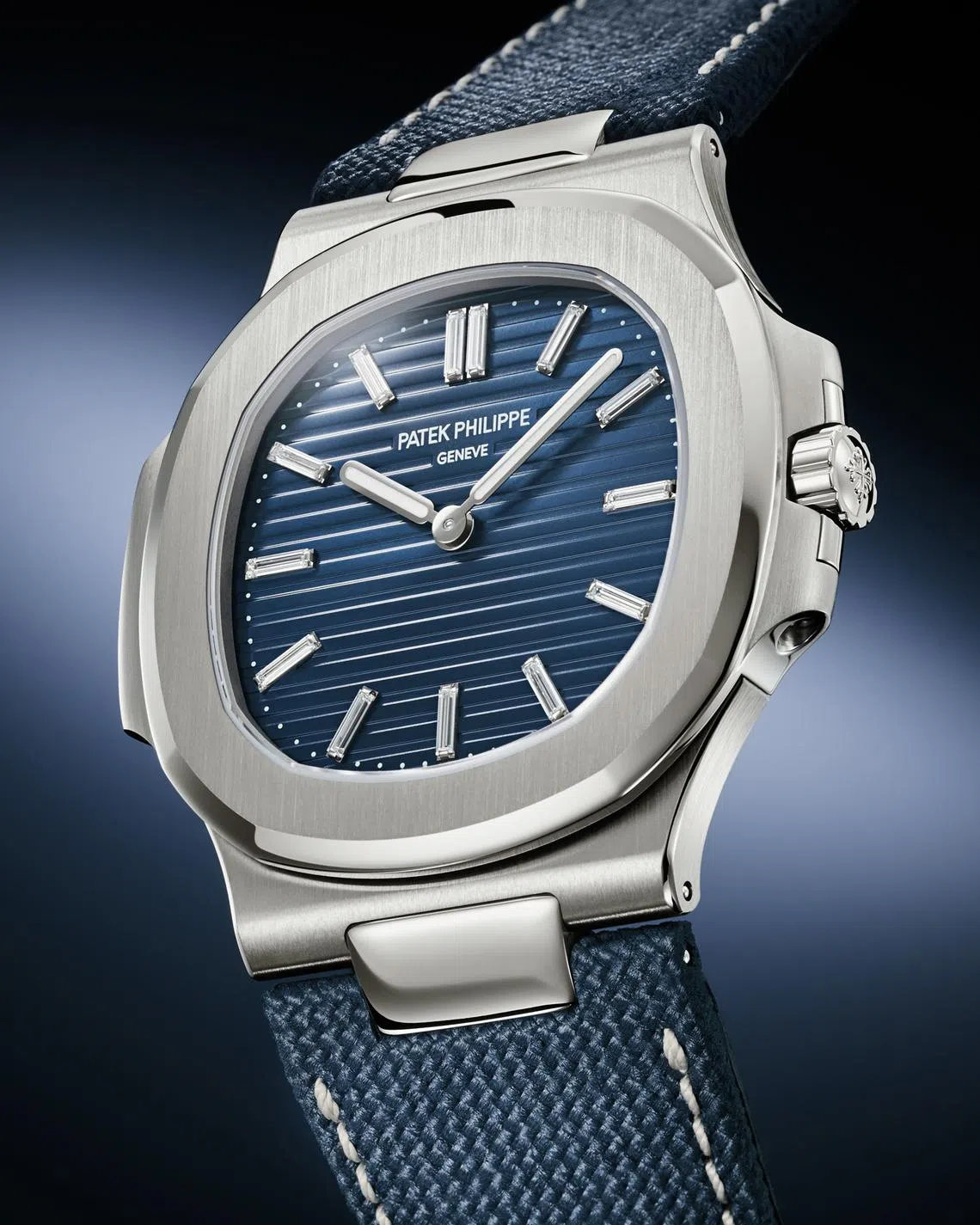 The Ref 5810G, limited to 1,000 pieces, takes a slightly more dressed-down route with its navy blue textile-pattern strap, but look closer and you will notice the classy baguette diamond hour markers.