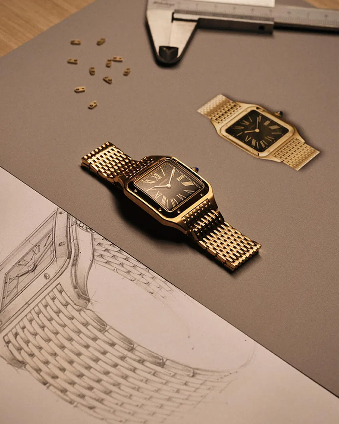 At just 0.3 mm thick, the dial is delicate to produce. It is paired with an extremely supple yellow-gold bracelet inspired by Cartier’s made-to-measure metal bracelets from the 1920s. The flexibility comes from 1.15 mm links; each section is made up of 15 rows and 394 elements, all machined, finished and assembled at the manufacture.