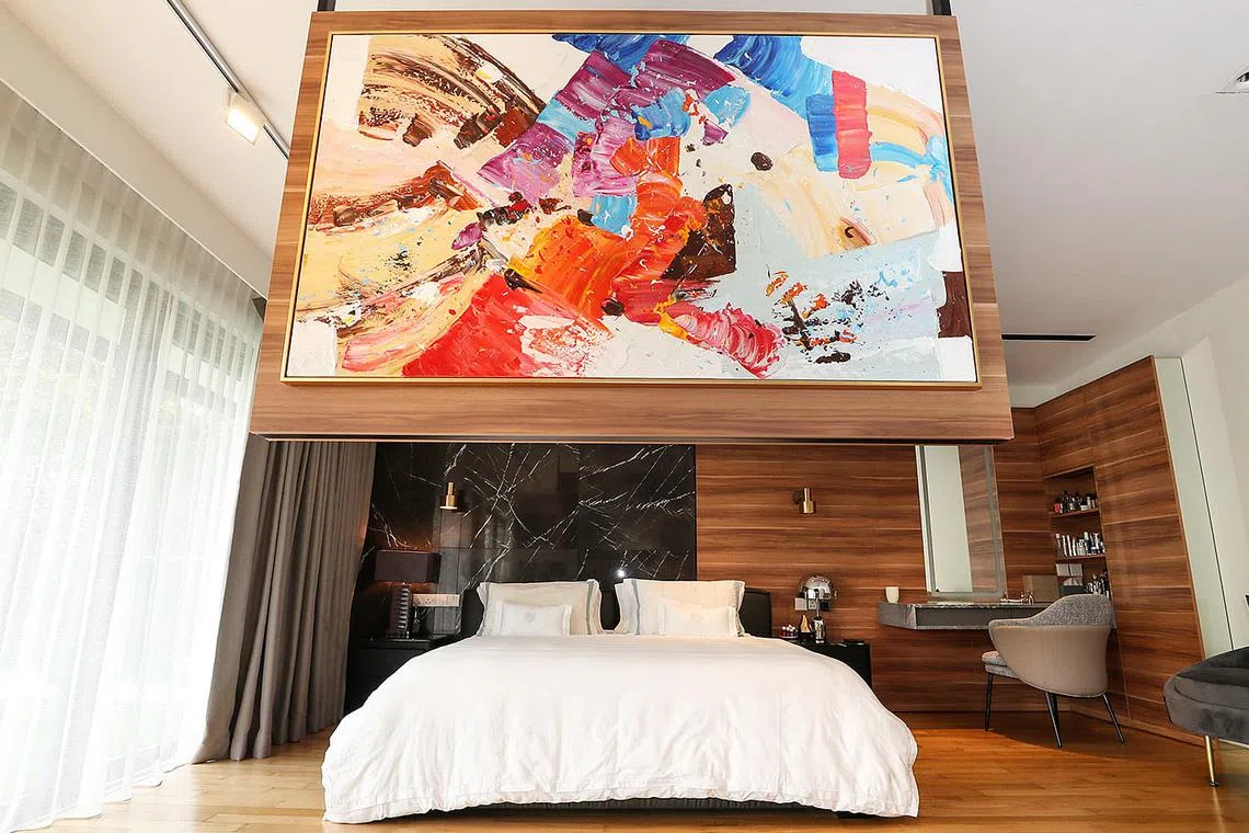 In the attic where the couple's bedroom is located, a colourful painting hangs from the ceiling in the centre of the room. Mrs Phuan has specially selected the piece because "it adds vibrancy to the otherwise grey tones of the room".