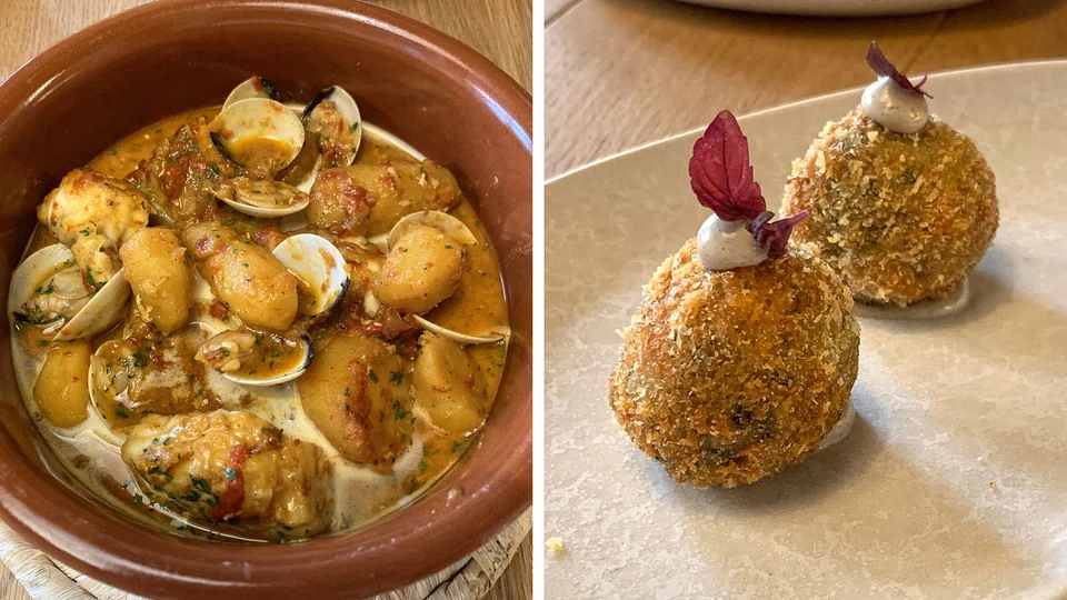 Bombas (S$8) are new to us and taste like balls of shepherd's pie - minced beef wrapped in mashed potato - deep-fried in a crumb crust and topped with a dab of spicy sauce and garlic aioli. They're amiable, comforting nuggets, much like the truffle and mushroom croquettes (S$7) filled with a fragrant, thick bechamel mixture that's chockfull of minced fungi.