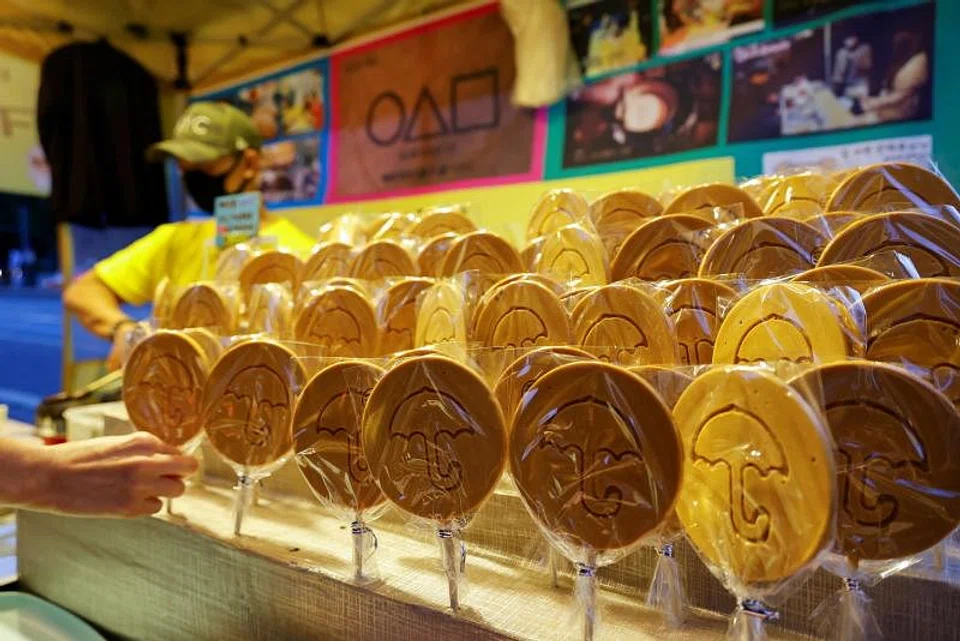 Dalgona is typically sold with a variety of shapes but"Squid Game" featured four, a triangle, circle, star, and an umbrella. One piece is about 2,000 won (S$2.29) but you can get a buy-one, get-one-free deal if you don't crack the first one.