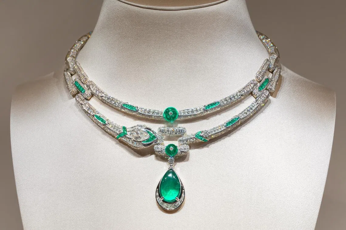 Another stunning piece is the Serpenti Emerald Nimbus necklace in white gold, which features a geometric-style serpent in diamond and emeralds reaching for a centrepiece 12.73-carat emerald from Zambia.