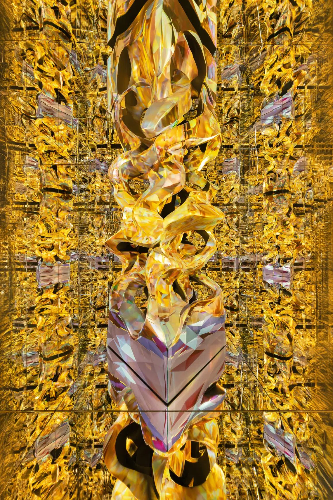 Then there are the interactive works such as New York-based Israeli-American artist Daniel Rozin’s Snake Scales Mirror. The installation presents a wall of kinetic golden “scales” that respond to the viewer’s presence and movements via a camera and custom-designed software.