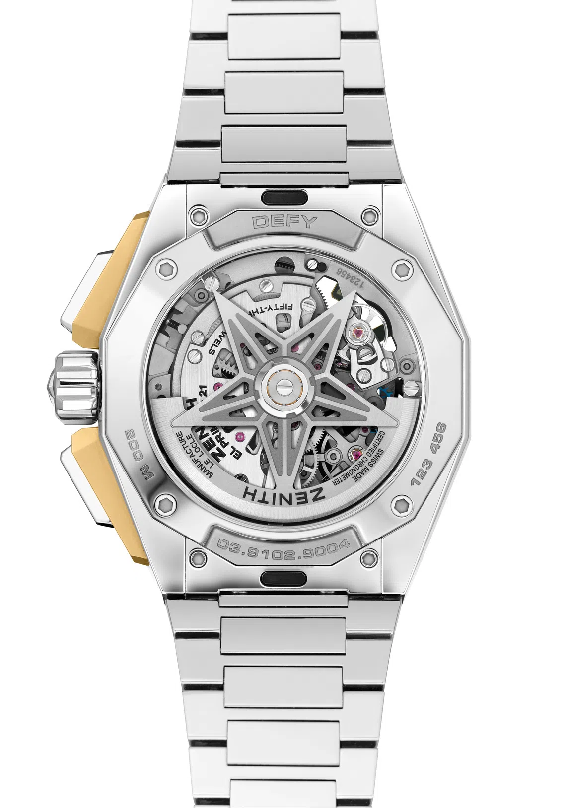 Beyond the lapis lazuli facade, gold and steel lies one of the most remarkable chronograph movements in modern watchmaking: the El Primero 9004 calibre. This formidable engine remains the only mechanical chronograph in regular production capable of measuring 1/100th of a second. It achieves this through a dual-escapement architecture built for extreme precision.
