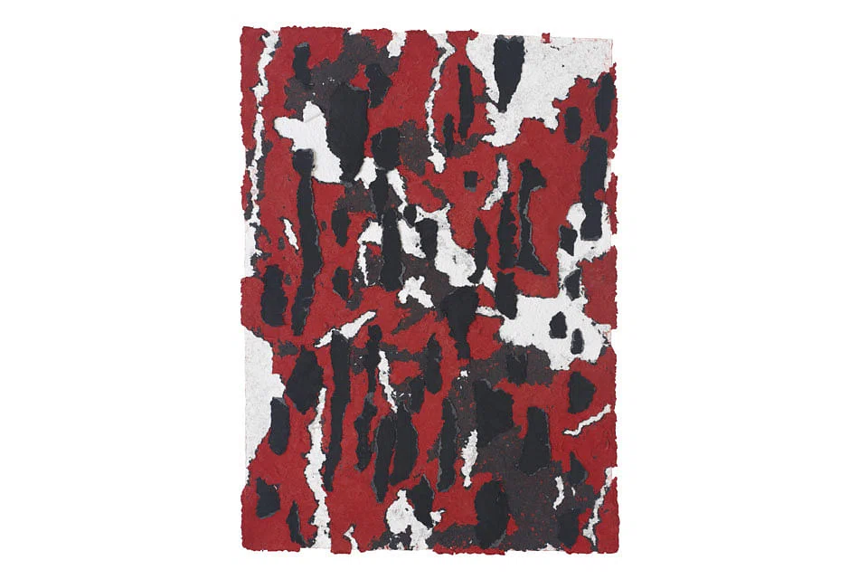 For her gorgeously diaphanous paintings, she painted acid on copper plates and printed the image on paper. And for her decollages, she applied her own body weight to imprint on paper pulp, describing it as a "performance" on pulp. One result - a red, black and white decollage titled Imprint By Subtraction: Performance 1- is particularly stunning.