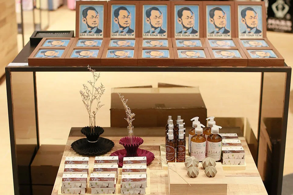 Linocut artist Joseph Chiang from Monster Gallery also offers exclusive items, such as his LKY linocut prints of which there are only 50 pieces, as well as the National Theatre tote bags and T-shirts.