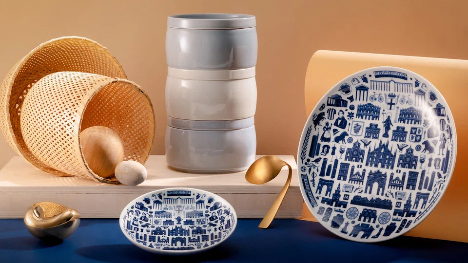 Among the works is the Tingkat Set - two porcelain bowls and a plate inspired by the traditional tiffin carrier and done in collaboration with local design firm Studio Juju. Another highlight of the collection is the Milan Icons plate, which has icons of the Italian city on it. It is inspired by a similar one of Singapore that Supermama is famed for. Mr Low says Milan Icons is designed in Singapore, made in Japan and inspired and presented in Milan.