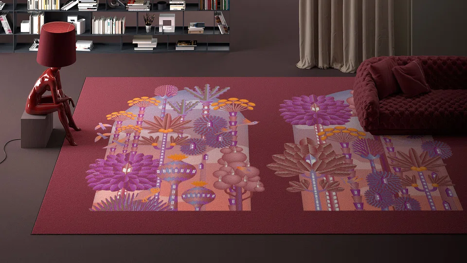 The duo's Biophilic Futures & Portals collection features plants and animals printed on its rugs and wallpaper.