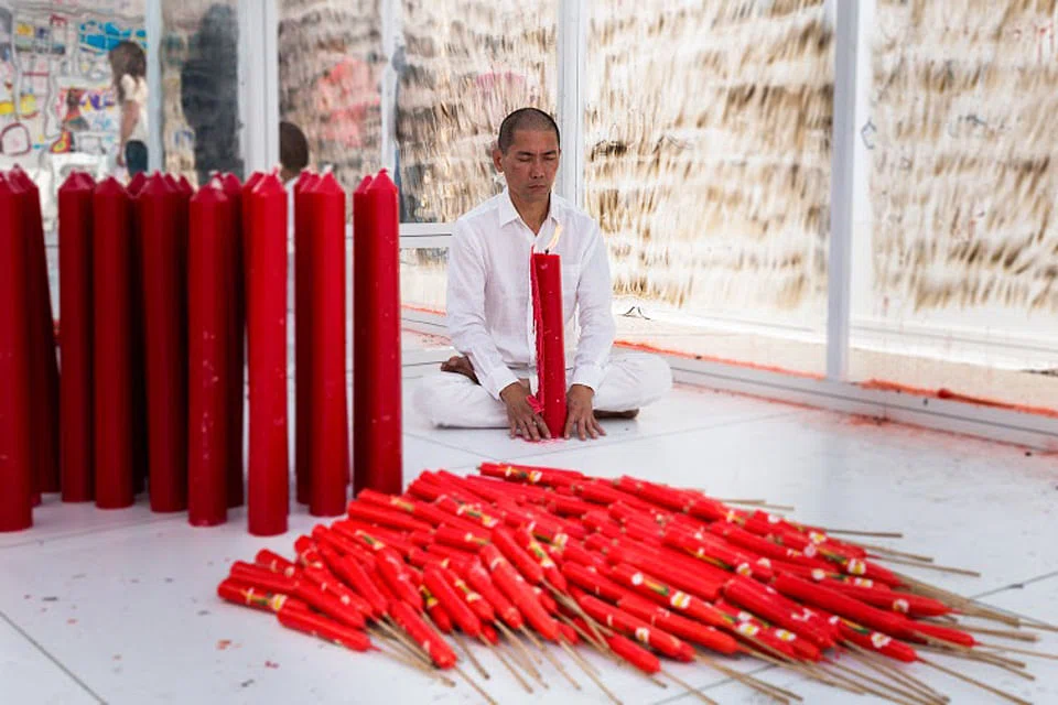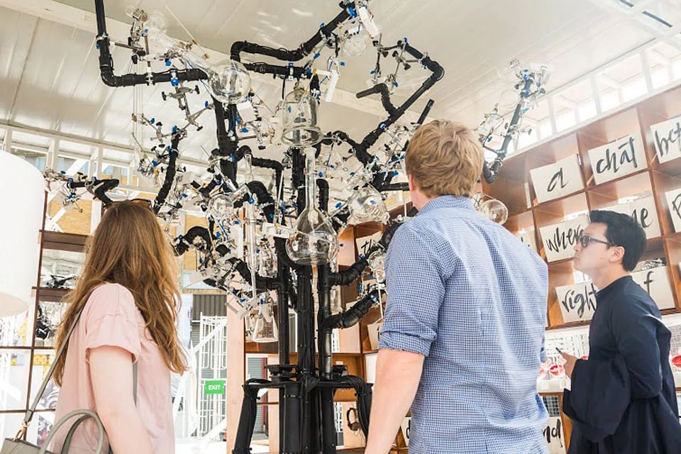Mr Chan houses the showcase in a large structure made up of scaffolds and makeshift walls "to reflect Singapore's arts scene as a work in progress". Within it, dessert chef Janice Wong created an edible art room filled with lollipops, chocolates and gummis in local flavours such as laksa, pandan and gula melaka. Visitors are allowed to pluck the candy from the wall and eat it. Not surprisingly, a queue quickly formed outside the attraction.