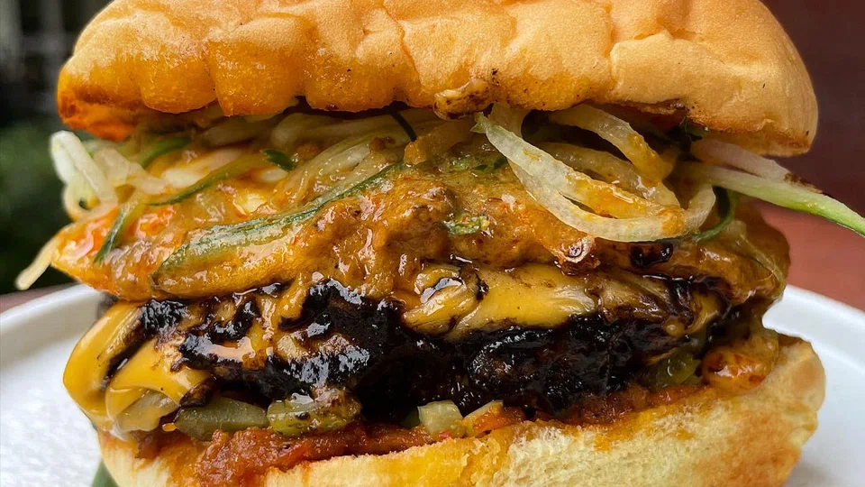 "The classic Ramly - there's a unique texture to the patty that's why it's called "ramly" - is seasoned with MSG and Maggi sauce, and comes wrapped in omelette and an overload of mayo, ketchup and chilli sauce," says chef Han. Miss Vanda's Van-Li (S$28) is made with a wagyu chuck patty seasoned with concentrated dashi stock and Maggi sauce, wrapped in a thick, fluffy omelette with cheese ("because Singaporeans like cheese in their burgers") and stuffed into a brioche bun.