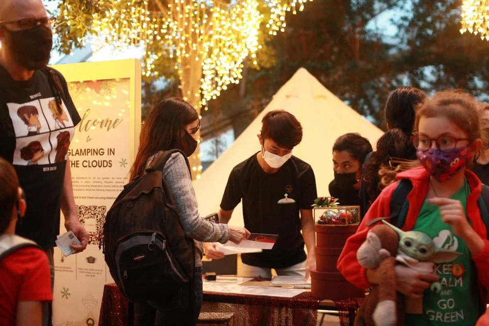 Glamping isn't cheap. Guests spend up to S$360 a night for queen-sized beds, shopping discounts, a cool box for picnics and plenty of festive Christmas lights. Private bathroom facilities are not provided.