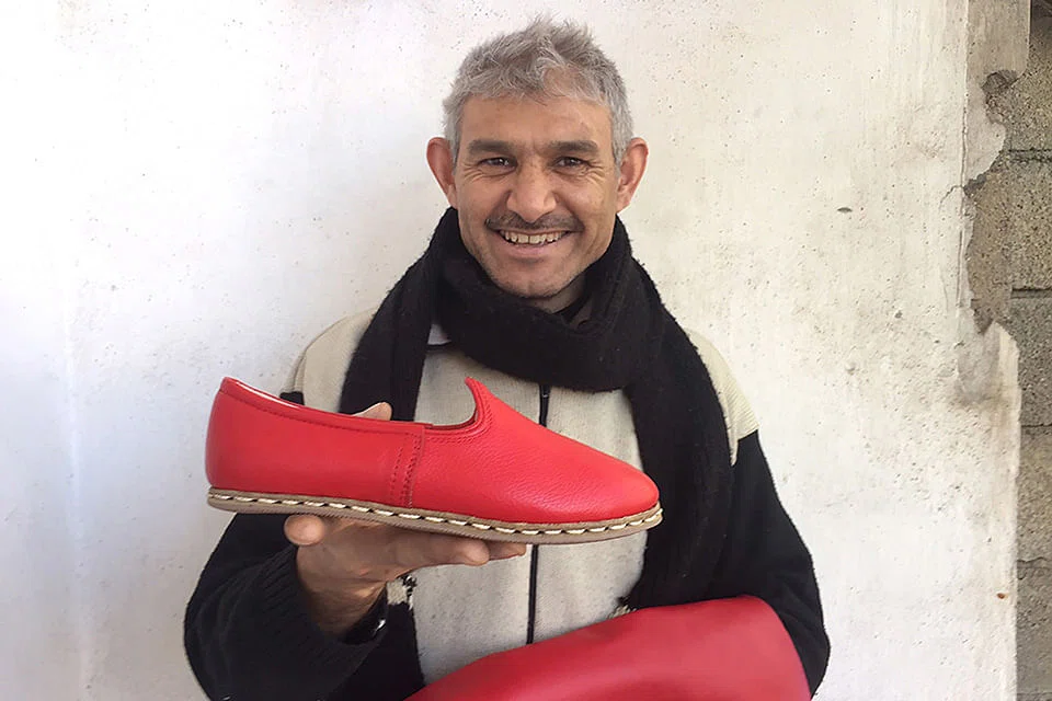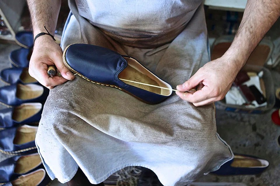 Each shoe is handcrafted in the traditional fashion, without machinery or pre-punched holes; and each pair is marked with the handwritten initials of the Turkish cobbler who made them.