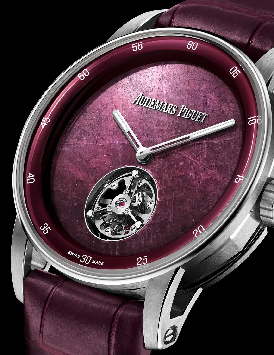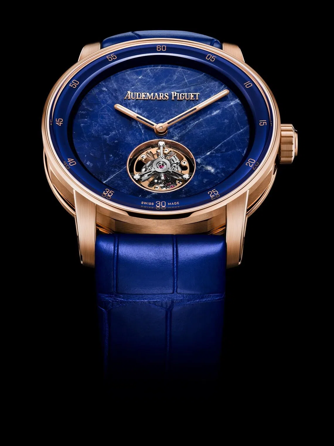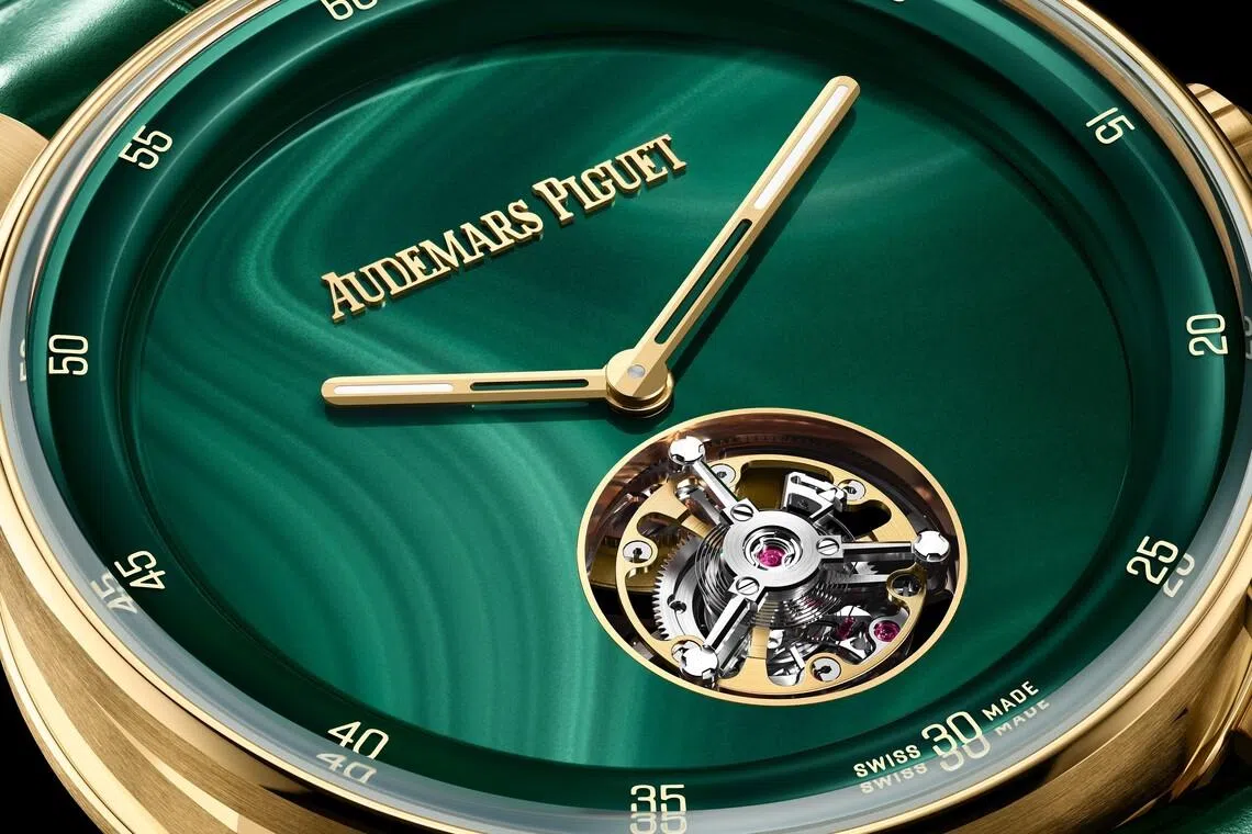 AP’s mastery of miniaturisation is further expressed in a limited-edition trio of the Code 11.59 by Audemars Piguet Selfwinding Flying Tourbillon, also in a refined 38 mm case. These pieces revive a 1960s tradition of natural stone dials, featuring wafer-thin layers of vivid ruby root from Tanzania, deep blue sodalite from Brazil, and rich green malachite from Zambia.