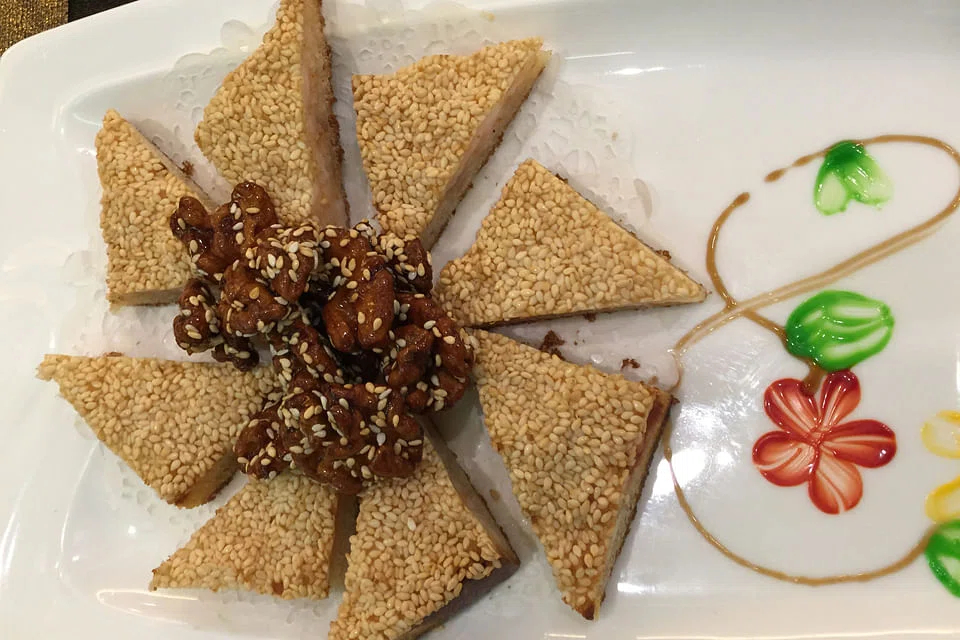 But if you'd rather just nibble, then check out the shrimps with sesame and peach kernel (S$22). We order it partly to find out what peach kernels are, but they turn out to be candied walnuts surrounded by shrimp "toast" - chopped shrimp meat spread between two thin layers of dough, covered with sesame seeds and deep-fried into oily but crunchy canapes.