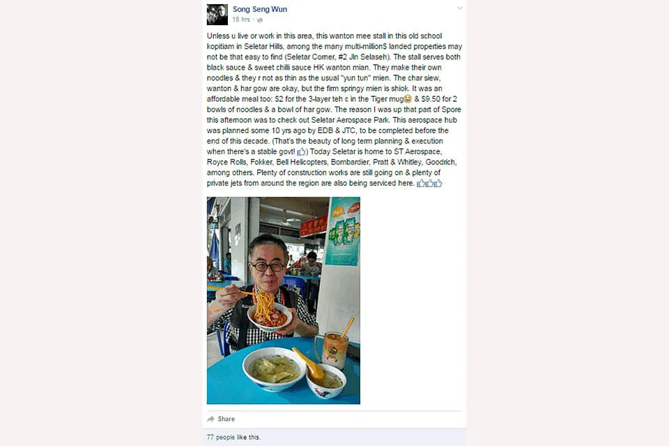 Take his Sept 16 post, for example. Mr Song ventured into Orchard Road for lunch to gauge the busyness of the shopping street, ahead of the Formula One weekend. Apart from sharing the details of his meal - S$12.50 roast pork noodles from I Want My Noodles, Shaw Centre - he also mused about the haze's impact on the country's hospitality sector.