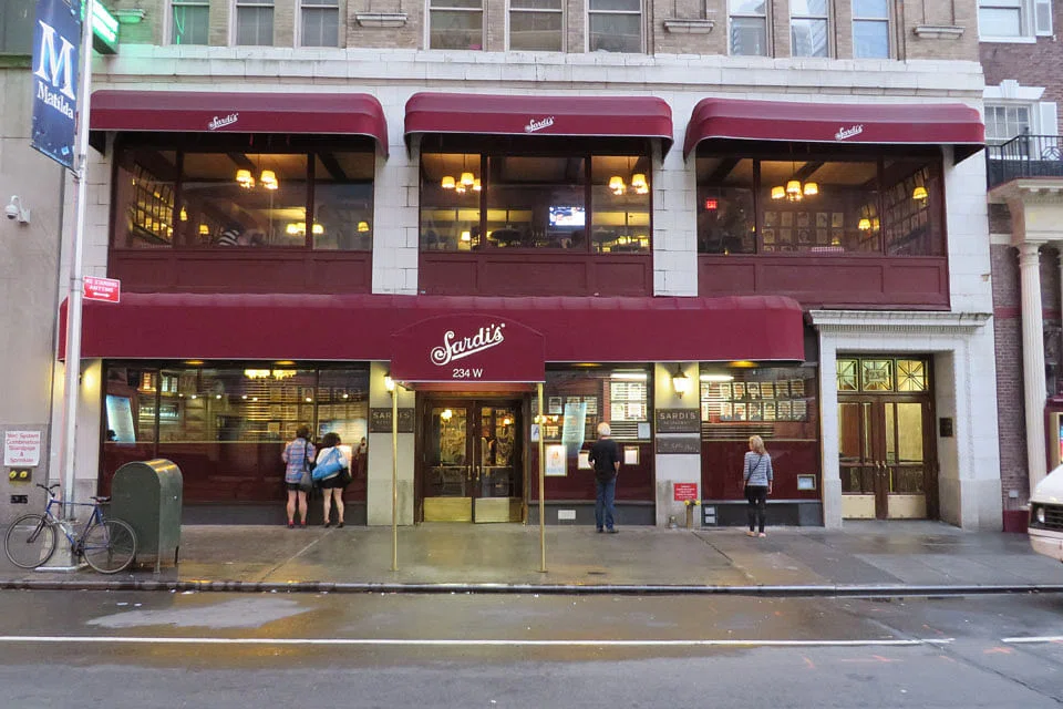 In the years after World War II, Sardi's, on West 44th Street in Manhattan, was practically synonymous with Broadway. People such as the playwright Tennessee Williams and the actors John Barrymore and Helen Hayes frequented the restaurant, and opening-night theatre reviews in The New York Times and The New York Herald Tribune were distributed to diners when the ink was barely dry. Some of the restaurant's glory may have faded since that heyday, but it remains a staple of the neighbourhood, cherished especially by those who see tradition in its red walls, lined with drawings of famous patrons.