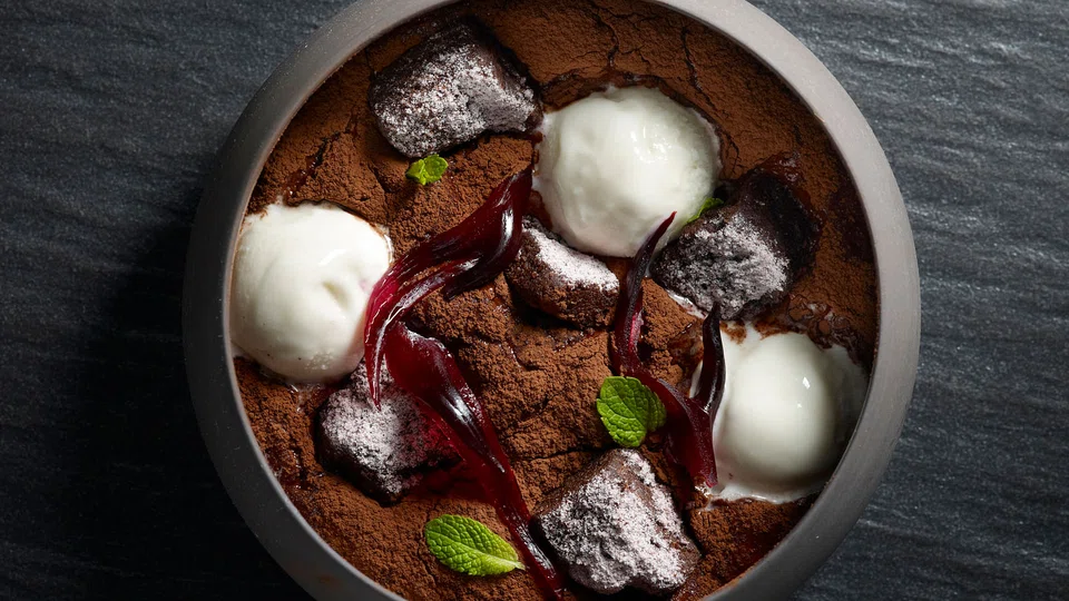 You're better off in safer territory with Ceiba ($14) where chocolate brownie squares nuzzle happily with their mousse and sauce brethren, while ginger ice cream and preserved rosella add a refreshing perspective.
