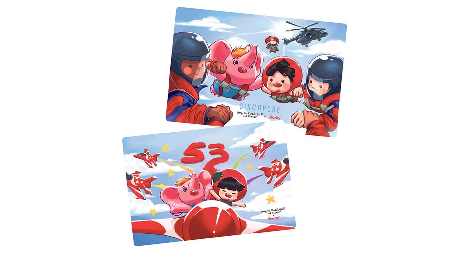Local artist Wang Shijia has created a set of EZ-Link National Day 2018 commemorative cards featuring well-known characters: Community Chest's mascot, Sharity; local cultural character Ang Ku Kueh Girl, created by Ms Wang herself, and showstoppers of National Day Parades the Singapore Armed Forces Red Lions and Republic of Singapore Air Force Black Knights. One of the designs depicts Sharity and Ang Ku Kueh Girl holding hands with the Red Lions while the other portrays them soaring into the skies together with the Black Knights fighter jets, a tribute to their past years' performances.