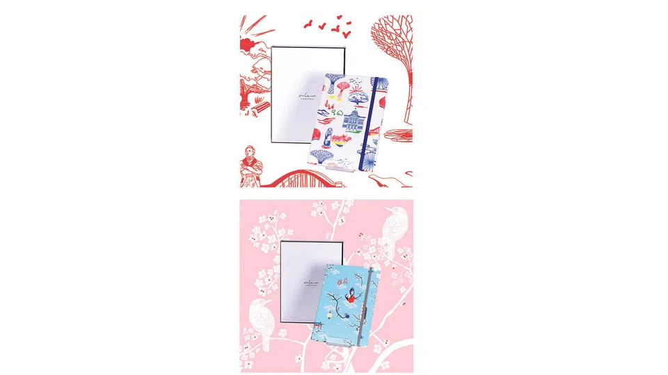Singapore Downtown has illustrations of otters, Gardens by the Bay and Victoria Concert Hall. His second notebook is on Chinatown and has illustrations of People's Park Complex, lanterns and a wayang performer.