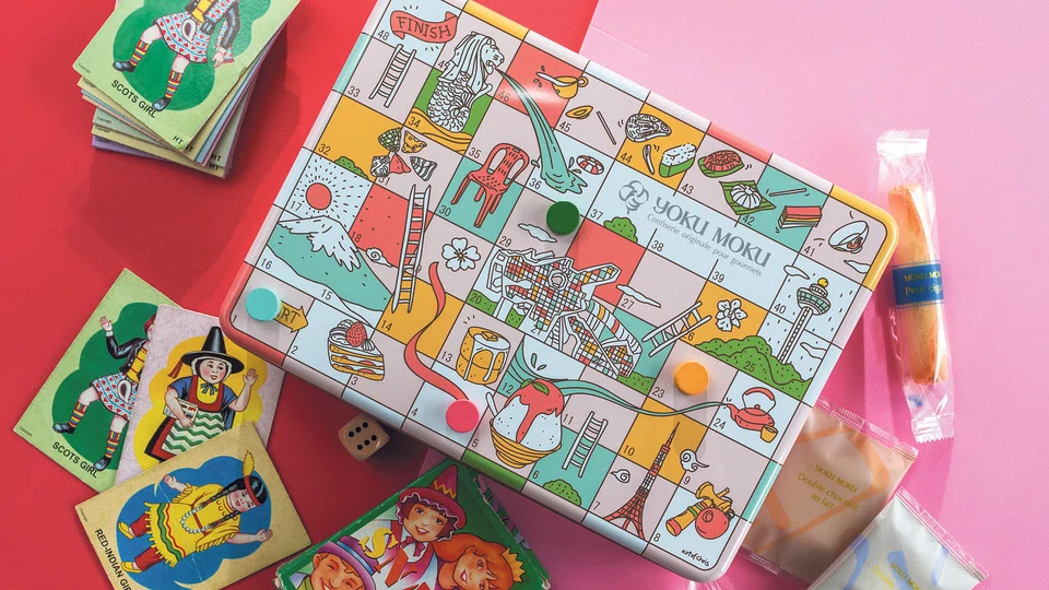 In Japan, YOKU MOKU cookie tins have become collectibles. And now Singaporeans have a special tin to call their own. The confectionery company collaborated with up-and-coming Singaporean artist, Christopher Chew, to design the Singapore Heritage Tin, featuring icons of Singapore and Japan. As part of his design, Mr Chew reinterpreted Tokyo Tower, Mount Fuji, Singapore's iconic dragon playground and the Merlion. The design of the Singapore Heritage tin also incorporates the classic game "Snakes and Ladders". Each tin comes with a matching set of wooden magnetic pawns, a dice, and an assortment of cookies.