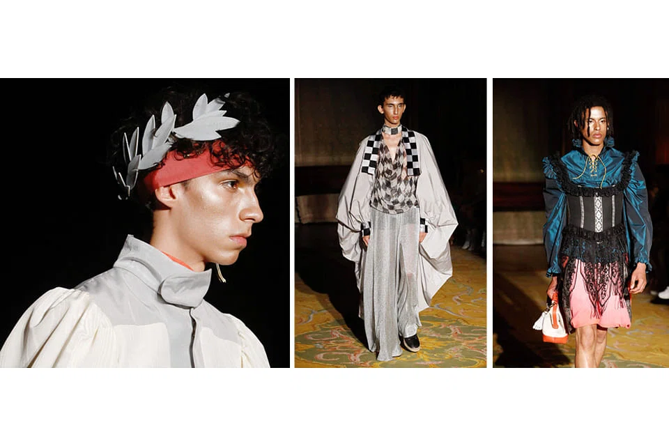 To the sounds of imperial trumpets, he sent out his resurrected Roman dandies, socialites and emperors in clever and erudite clothes made from everything from jute to the flounciest feathers.