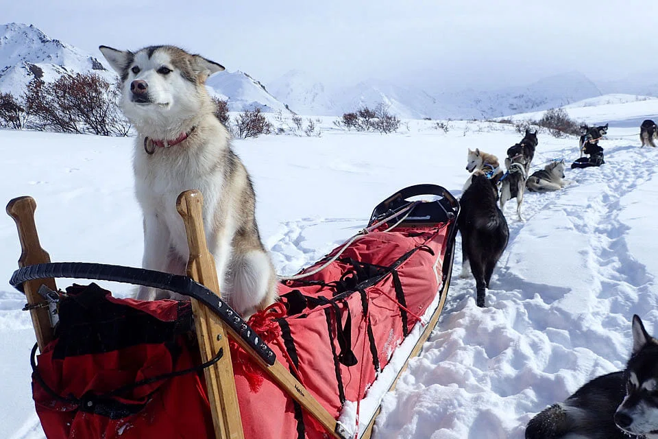 Denali is also home to a one-of-a-kind team of canine park rangers: 31 enthusiastic Alaskan huskies pull sleds, helping transport park rangers and loads of heavy equipment in the snow.