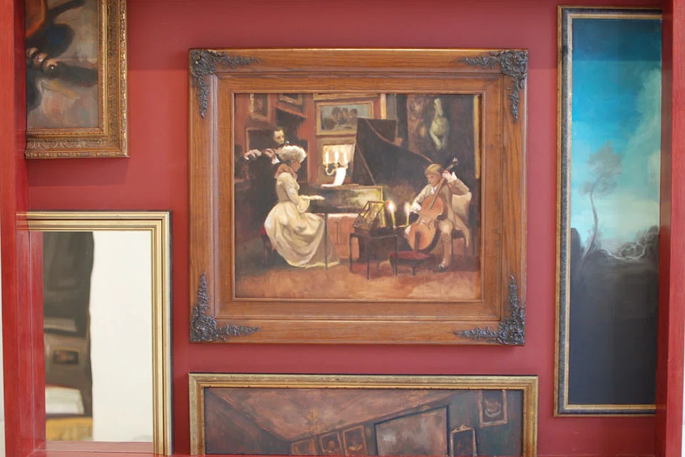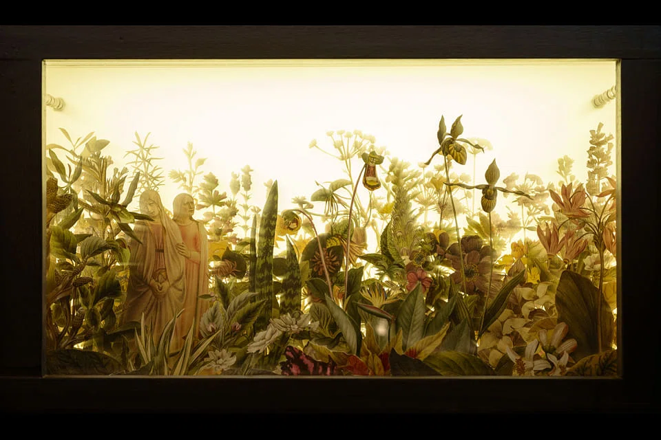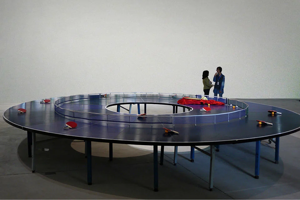 AN urban landscape. A horseshoe- shaped ping-pong table. Madonnas in a fantastical garden wonderland.