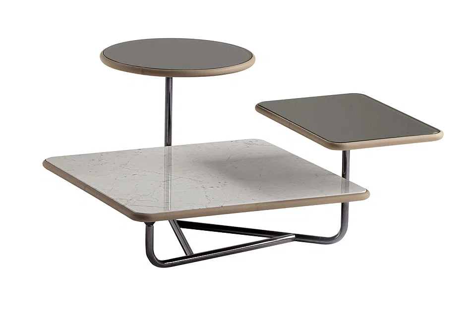"Another upcoming trend is the use of natural stones in the finishes. But if you don't like tables in one finish, the Trois Coffee Table allows you to have two. One of its surfaces is made of white Carrara marble, while the other two are in tempered glass."