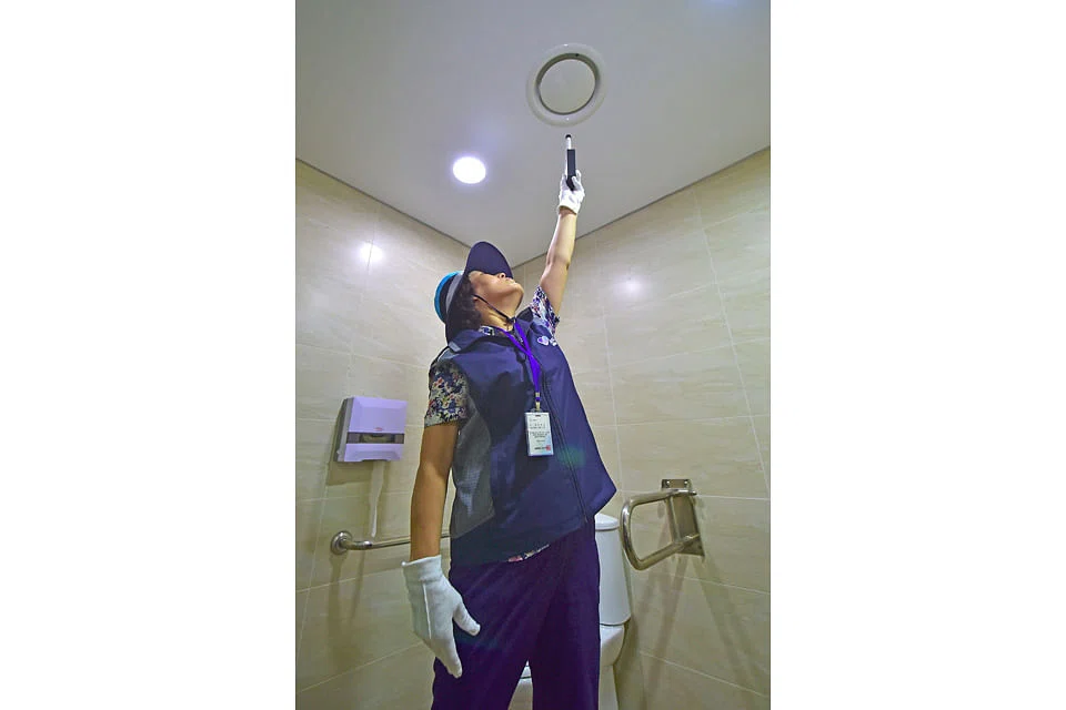 WALKING into an empty women's bathroom stall, Park Kwang-Mi waves a hand-held detector around the toilet seat, paper roll holder, doorknob and even the ventilation grill on the ceiling.