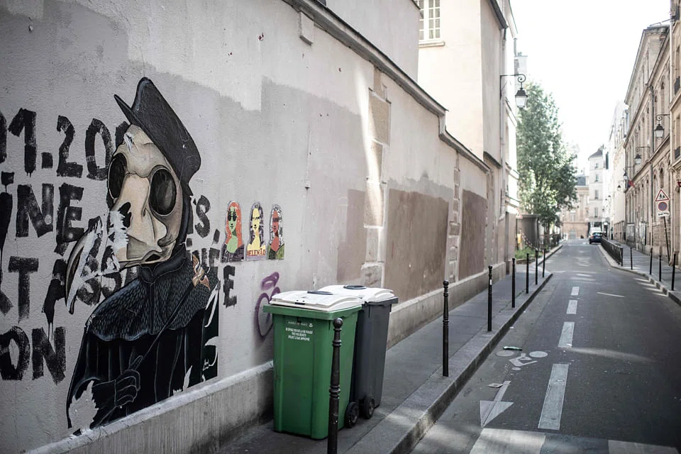 A larger-than-life collage in the Marais district entitled Senor cuervo senora peste (Lord Raven, Lady Plague) - now partially destroyed - features a character dressed as a doctor during the Black Death. It was the last thing he put up before confinement was imposed.