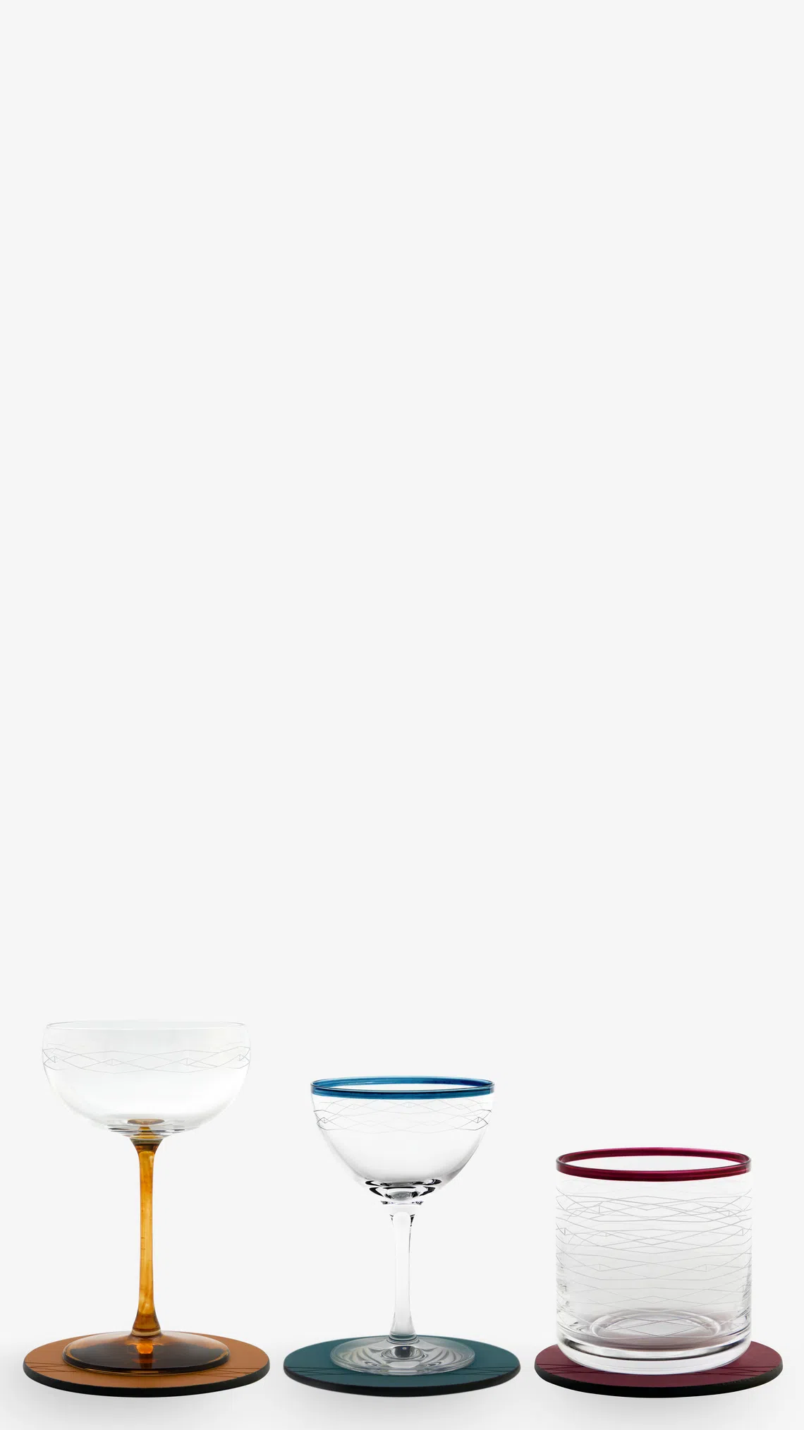 Created by French lifestyle brand, Maison Sarah Lavoine, the three cocktail glasses in classic designs come with matching coasters. Precisely blown and tinted, the borosilicate glass on the glass tumbler and two coupes is etched with MGallery’s distinctive diagonal geometric pattern, then set against Maison Sarah Lavoine’s exclusive colours. These come in the form of a rich amber stem, as well as deep red and iconic Sarah Blue rims.
