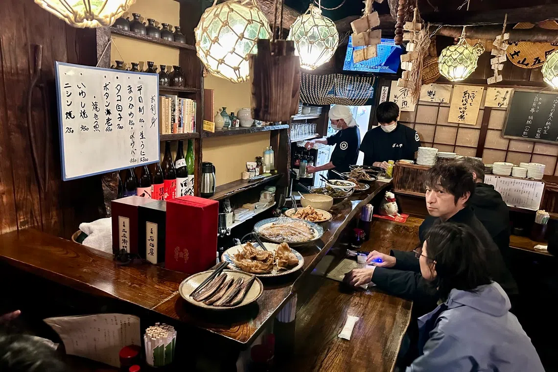 Back in town, try to snare a table at Banya in Tsuitachimachi, a tiny izakaya whose owner opens and closes as he pleases. It’s old-fashioned fun as you squeeze into tiny tables and order plates of mackerel, giant whelk, plump botan ebi, and even a sampling of stir-fried horse meat that tastes like a cross between beef and pork. Not something we would re-order.