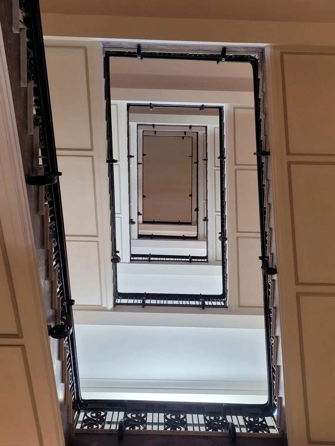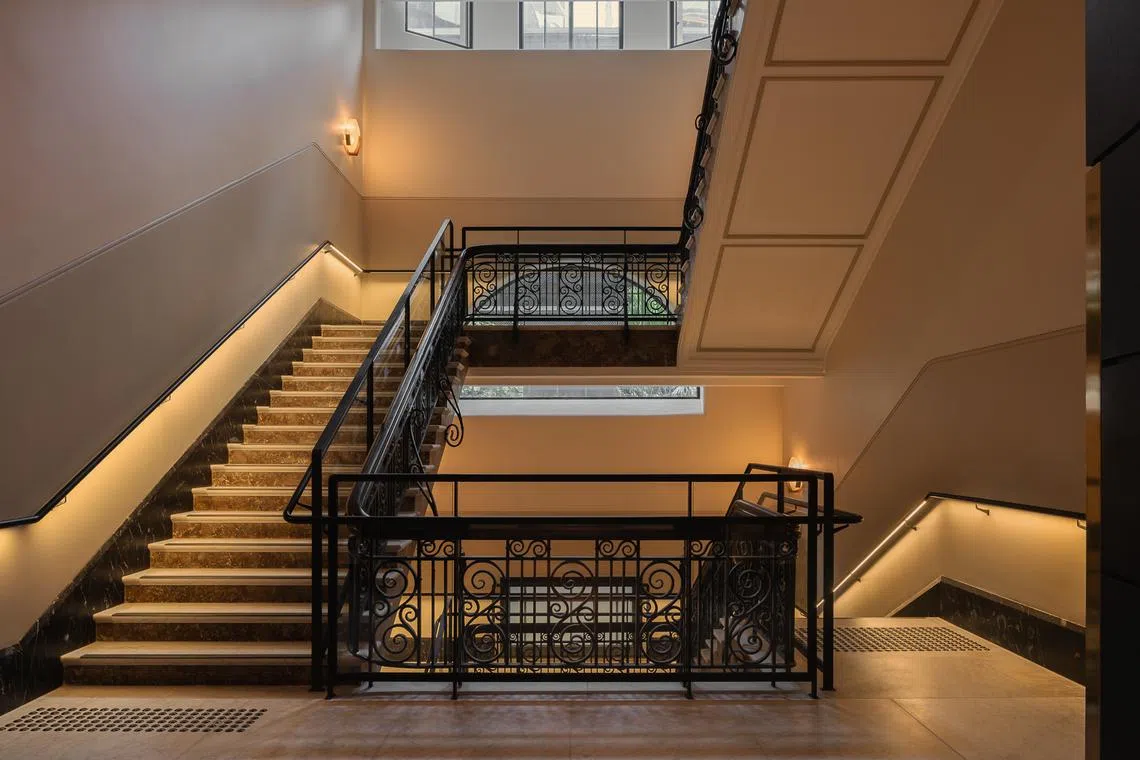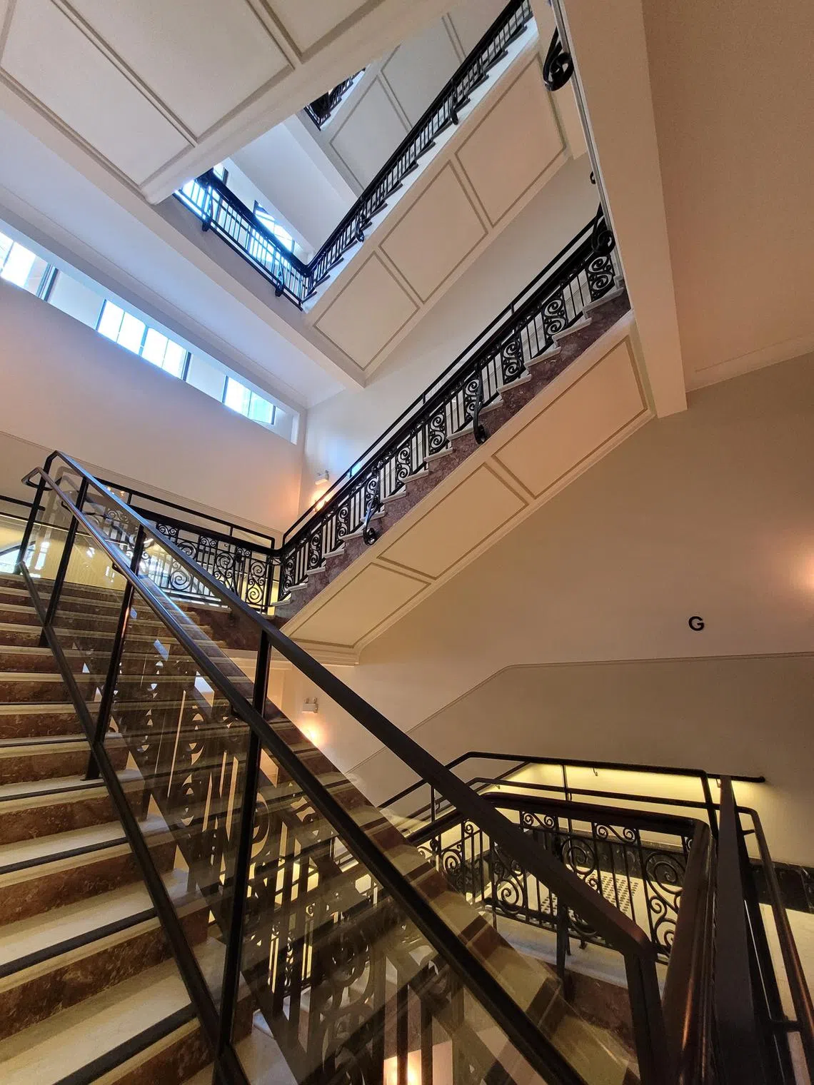 Plus, waiting to pick up your car along the hotel’s Bridge Road entrance means you’re more likely to admire up close its beautifully restored heritage staircase, which begins here. The staircase works its way up behind custom timber doors and sidelights in front of the guest lifts on every floor. Most guests, though, do no more than cast a glance at their charming aesthetics.