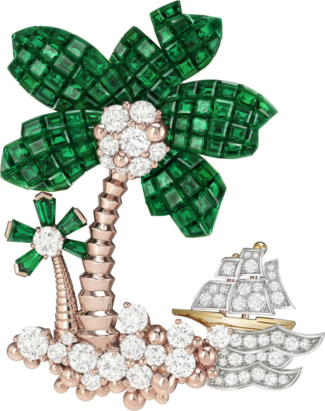 Think a rolled-up golden treasure map with tiny engravings of secret locales painstakingly done by hand, and an emerald palm tree with interchangeable motifs symbolising the three chapters – a diamond-encrusted boat, a golden sun and a chest of precious stones.