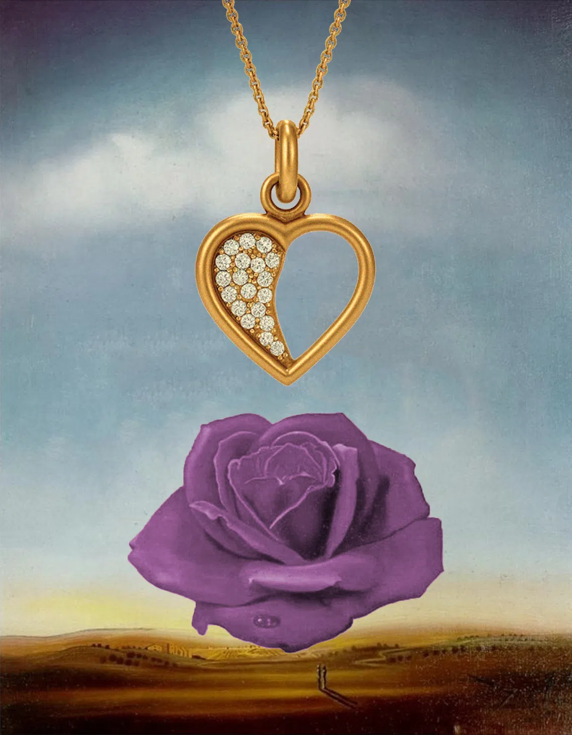 In Parallel Hearts, a heart-shaped pendant is partially filled with gold and diamonds to represent words that should have been said and the pledge to speak from the heart before it’s too late.