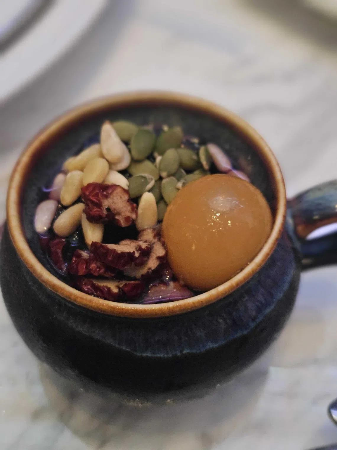 You should also try the Ssanghwa-tang – a cocktail version of the traditional Korean herbal tea often enjoyed with honey or an egg yolk. A perfectly spherical “yolk” sits atop a mixture including pumpkin seeds, pine nuts, clove, cinnamon, sesame, Korean medicine and red and white wine.