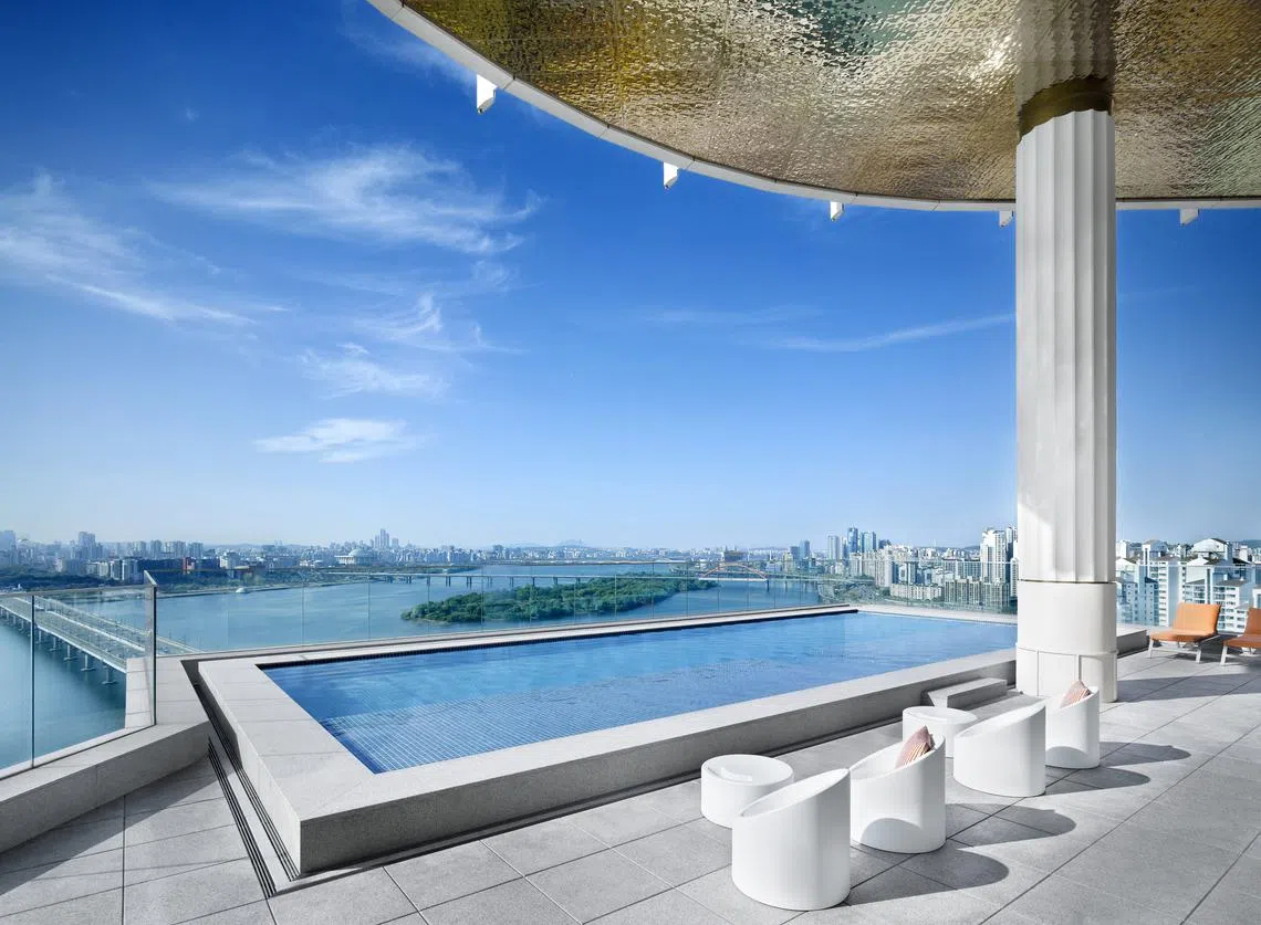 The 196-room hotel is located in Mapo, right by the Han River and a four-minute walk from Mapo station. With its 25-metre indoor pool and outdoor infinity pool both heated and overlooking the city and river from the 20th floor, it doesn’t take long for us to head there for a relaxing swim.