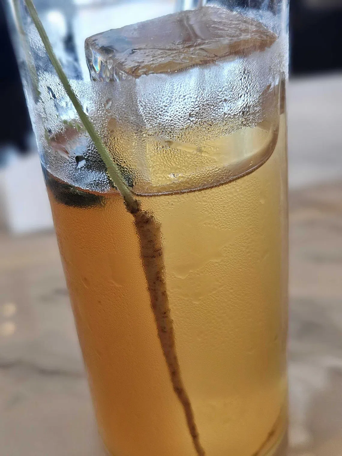 The Timeless Negroni, on the other hand, is earthy and rich, with Citadelle Gin Original infused with sandalwood, red vermouth, as well as Italian bitters instilled with pineapple and pandan. An oval ice cube floats intriguingly in the cocktail, which is presented in a Maison Sarah Lavoine Old Fashioned tumbler.