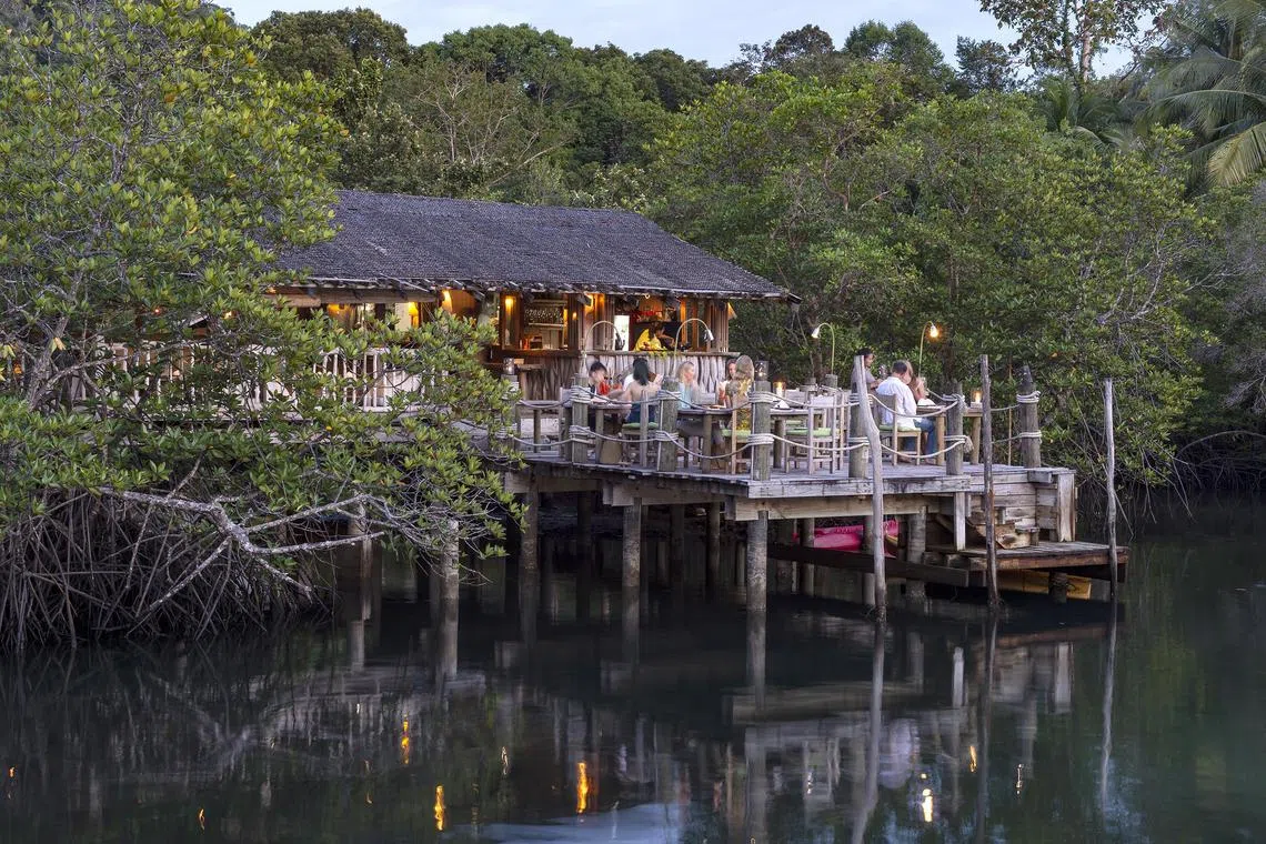 There’s a chance to venture out of the resort for a five-minute drive to Kruua Mae Tuk, a quintessential idyllic “floating” restaurant overlooking a tranquil bay where you watch a lone fisherman silently paddle past and disappear into the surrounding forest. Resident chef Khun Tuk whips up simple but excellent fare with just local seafood and vegetables laced with clean Thai flavours: a complex miang kham salad; sauteed local oysters and slipper lobster; and unforgettable fried chicken.