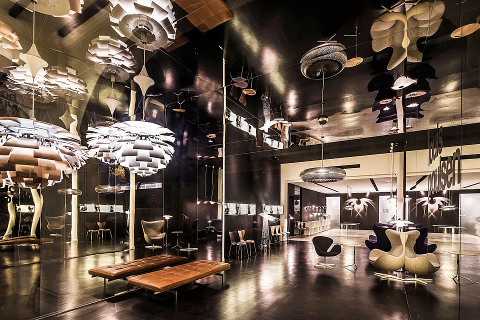 Separated into three distinct parts, the store is laid out in a progressive sequence that begins with the relation of Louis Poulsen's image with the street, proceeding on to a showcase of the brand's iconic designs, and ending with a reflective light box, where the lamps are being reflected, multiplied and experienced in their different dimensions.