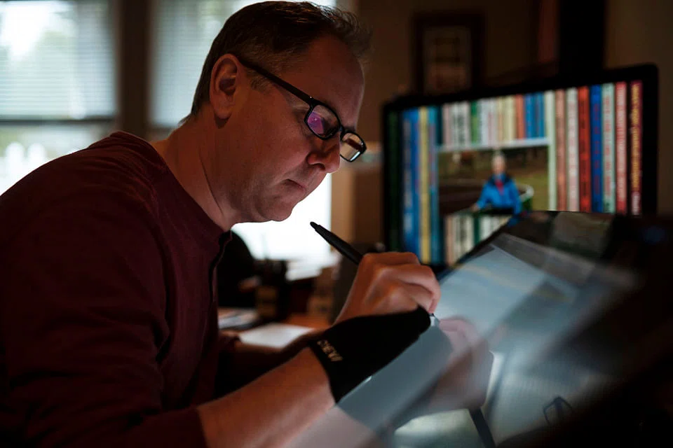 He found his footing using a Cintiq, a tablet that allows the user to draw directly on the screen, which has increased in size and resolution. "I don't buy erasers anymore. I don't buy inks. But every time there is a new Cintiq, I kind of indulge," he said.