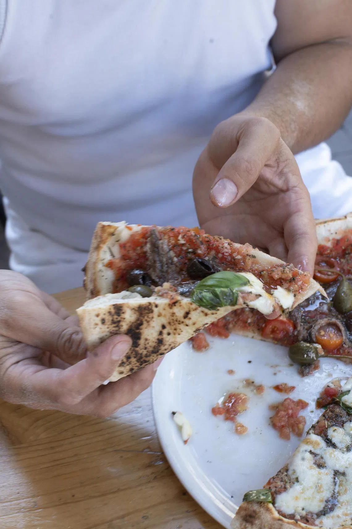 La Bella Pizza makes Marseille-style pizza topped with fresh garlic; Sapienza said a slice should be crisp enough to be held with three fingers – thumb, index and middle – and it should be hard on the bottom and soft inside.