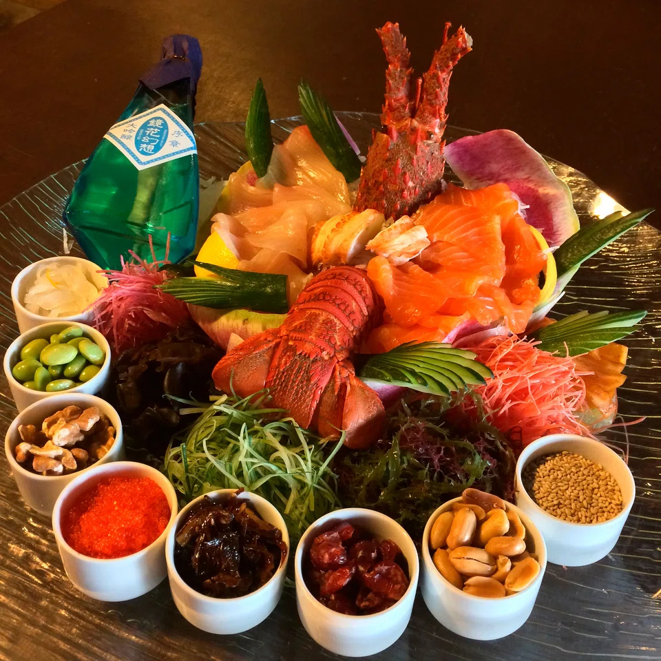 Oceans of Seafood's Vibrancy of Life yusheng comes with a Japanese twist. The yusheng, S$128, comes with a whole boiled rock lobster, salmon and amberjack sashimi. The amberjack is flown in from Tokyo's Tsukiji market, and the lobster is from the UK. The yusheng also has vegetables imported from Japan, such as the red and white radishes. Extra ingredients that are thrown in with a Japanese slant are edamame beans, and tobiko, or flying fish roe. For that extra luxe touch, the yusheng is garnished with gold flakes. Instead of an overly sweet sauce, the dressing here is sesame with a hint of wasabi.