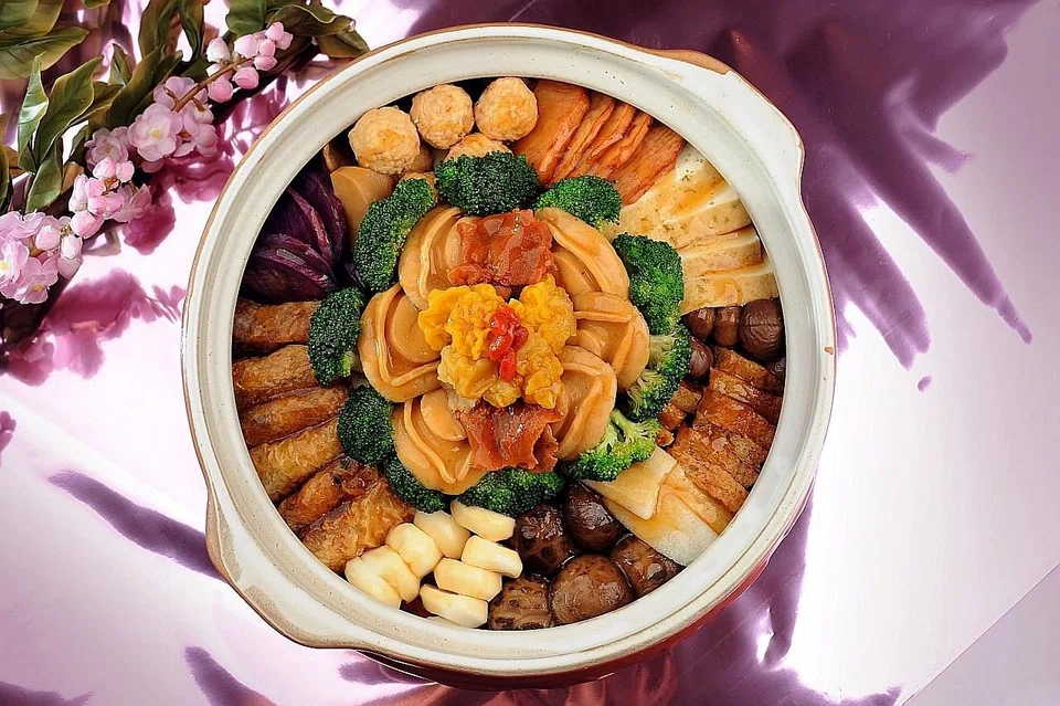If you're looking for a vegetarian option for your reunion dinner, try TungLok group's vegetarian take-home feast ($238 for 6 pax and $328 for 10 pax). It includes a vegetarian yu sheng, rice wrapped in lotus leaf, Thai-style deep-fried vegetarian fish, a TungLok nian gao, and a vegetarian pen cai featuring deep-fried beancurd skin rolls, chestnuts, vegetarian abalones, vegetarian lobster balls, braised tofu, taro, broccoli and bamboo fungus. Regular options are also available, in the form of their heavenly ($468 for 6 pax and $698 for 10 pax) and royal ($368 for 6 pax and $498 for 10 pax) take-home feasts. These include salmon yu sheng, signature TungLok treasure bowl (pen cai), fried glutinous rice with assorted preserved meat, herbal chicken, and one of TungLok's nian gao options.