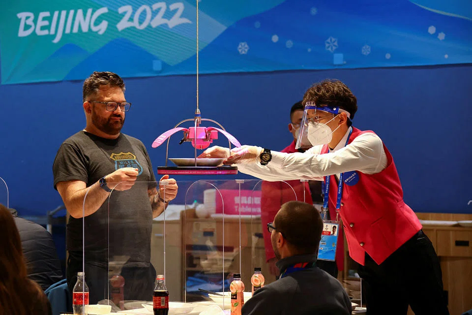 Tokyo also introduced a bubble for the summer Olympics last year, but it was porous and guests could walk around. Beijing's bubble is on a different level and has a slight doomsday theme. Hotel rooms usually provide guests with 1 complimentary bottle of water; my room provided 24 litres. As I stepped out on the first morning, an employee in a hazmat suit was heavily dousing the corridor carpets with disinfectant. The hotel restaurant serves food with disposable plates and cutlery. Masks are not only obligatory; they must be a certain kind: N95, KN95 or FFP2. Many staff supplement them with a visor.