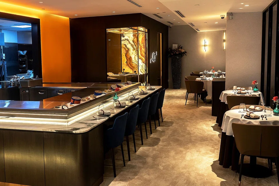 The place is small, tasteful, hardly ostentatious apart from the dining counter where tins of caviar sit on their stage of ice. It's rather pretty, with a restrained blend of rich orange feature walls and abstract patterns on lighted ceilings.